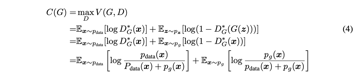 $C(G)=−log4+2⋅JSD(p_{data} ∥ p_{g})$