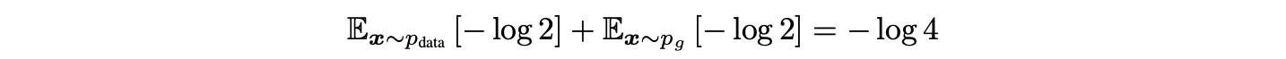 Proof. $p_{g} = p_{data}$라고 가정하면, 최적 판별기DG∗는DG∗(x)=1/2가 된다(Eq. 2 참고). 따라서 Eq. 4에 DG∗(x)=1/2를 대입하면 C(G)=log1/2+log1/2=−log4로 이 경우 C(G)는 −log4가 된다. 이 값이 C(G)가 도달할 수 있는 최솟값이며 오직 $p_{g} = p_{data}$일 때만 이루어진다는 것을 보이기 위해 다음 식을 살펴보자: