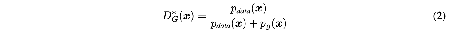 다음으로, 이 판별기 목적함수는 사실상 입력 x가 실제 데이터에서 왔는지(=1), 생성기에서 왔는지(=0)를 맞히는 이항 분류기의 로그우도를 최대화하는 것과 같다는 점을 알 수 있다. 이 해석을 통해 GAN의 미니맥스 게임(Eq. 1)은 아래처럼 최적 판별기 $D∗_{G}$를 사용한 형태로 다시 표현할 수 있다.