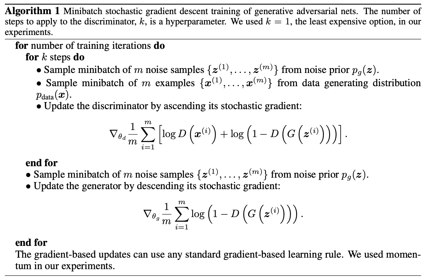 - 판별기 D를 먼저 여러 번(k회) 업데이트