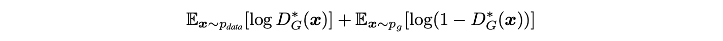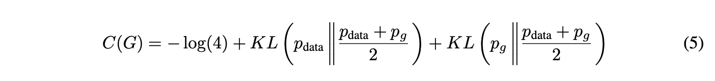 여기서 KL은 Kullback–Leibler divergence로, 두 확률분포가 얼마나 다른지 측정하는 비대칭적인 거리 척도다. 위 두 KL 항의 합은 모델 분포 $p_{g}$와 실제 분포 $p_{data}$ 사이의 Jensen–Shannon divergence(JSD)와 동일하다:
