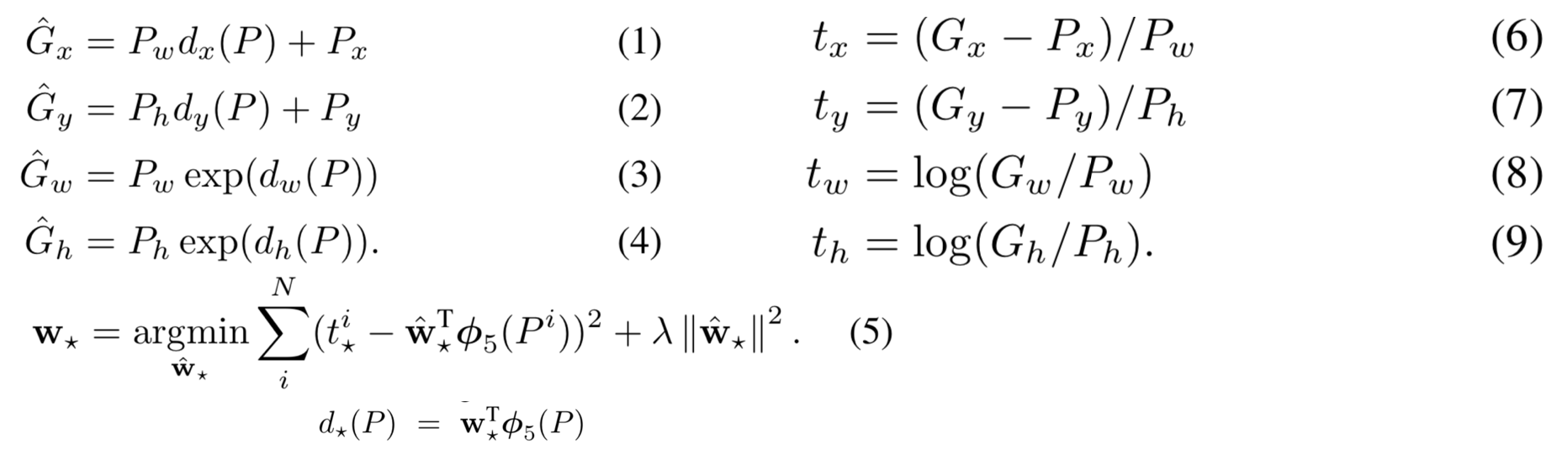 (1), (2), (3), (4) 식에 등장하는 Ĝ 값들은 Ground Truth(G)에 최대한 가까워지도록 예측해야 하는 변수들이다. 이 식들에서 Ĝ를 실제 Ground Truth 값 G로 대체하고, d를 t로 치환해 정답값을 표현한 것이 (6), (7), (8), (9)식이며, 이 식들이 바로 회귀 모델이 학습해야 할 실제 타깃 값이 된다. (5)식에서 시그마(Σ) 안에 들어 있는 항이 Bounding Box Regression의 Loss Function으로, 예측값 d와 실제값 t 사이의 차이를 줄이는 방향으로 최적화가 이뤄진다. 결국 회귀 모델은 이 Loss를 최소화하며 Proposal 박스를 Ground Truth에 가깝게 보정하는 변환을 학습하게 된다.