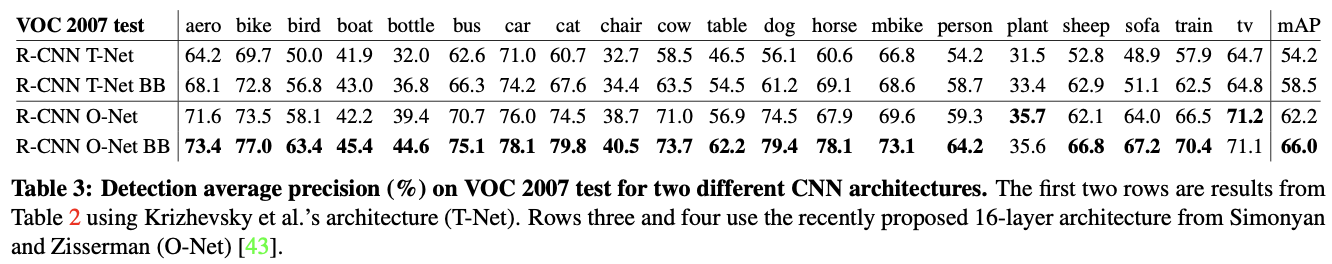 R-CNN의 성능은 사용하는 CNN 구조에 크게 의존하며, 논문은 AlexNet 기반 모델(T-Net)과 VGG-16 기반 모델(O-Net)을 비교한다. VGG-16은 훨씬 더 깊은 구조를 가지며, fine-tuning 후 detection 성능을 66.0% mAP까지 끌어올려 T-Net(58.5%)보다 크게 우수하다. 단 계산 비용은 7배가량 증가한다. 이는 더 깊고 균질한 CNN 구조가 region-based detection에서도 큰 이점을 제공함을 보여준다.