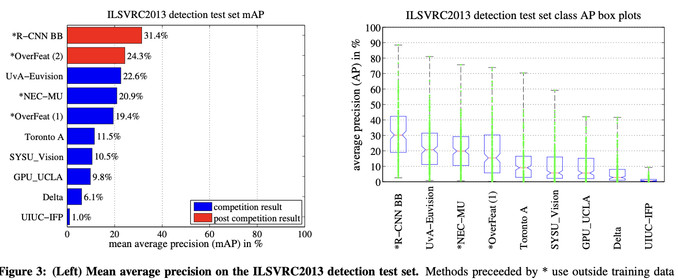 R-CNN을 ILSVRC2013 200-class detection에 그대로 적용한 결과, bounding-box regression 포함 시 31.4% mAP를 기록해 기존 최고 성능이던 OverFeat(24.3%)을 크게 능가했다. 이는 region proposal + CNN 방식이 sliding-window CNN 방식보다 전반적인 클래스들에서 더 강력한 객체 검출 성능을 제공함을 보여준다.