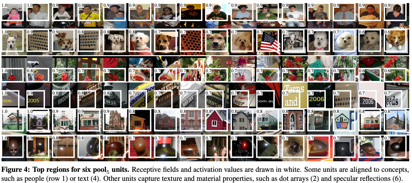 저자들은 CNN이 region-based detection에서 어떤 표현을 학습하는지 이해하기 위해 pool5의 각 유닛이 강하게 반응하는 region proposal을 대규모로 수집해 시각화하는 방식을 사용한다. 특정 유닛을 하나의 작은 detector처럼 취급해 높은 activation을 보이는 region을 나열하면 사람이 직접 설계한 특징이 아닌, 얼굴, 텍스처, 색 blob, 기하 패턴 등 다양한 고수준/저수준 시각 개념을 포착한 유닛들이 등장함을 확인할 수 있다. 이는 region proposal 위에서 CNN이 개념적이고 다양한 불변성을 가진 표현을 학습함을 보여준다.