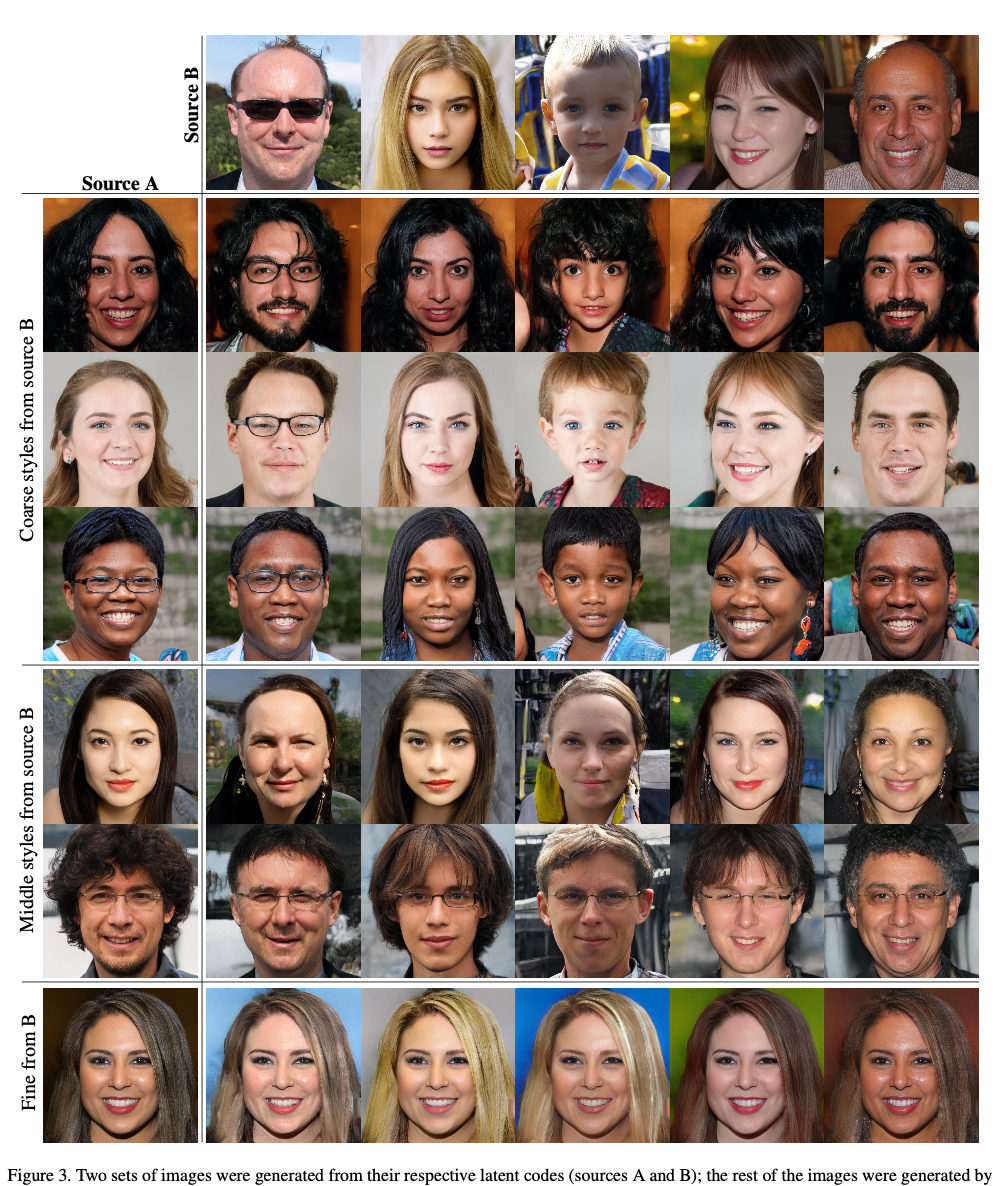 이런 방식을 적용하게 되면, 학습하는 Generator 입장에서 레이어마다 스타일이 계속 바뀌기에 어떤 스타일을 어느 레이어에서 써야 하는지 정확히 분리해야겠다라는 학습 압력이 생긴다. 따라서 아래와 같이 자연스럽게 레이어별 책임 분담이 이루어진다:
