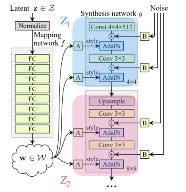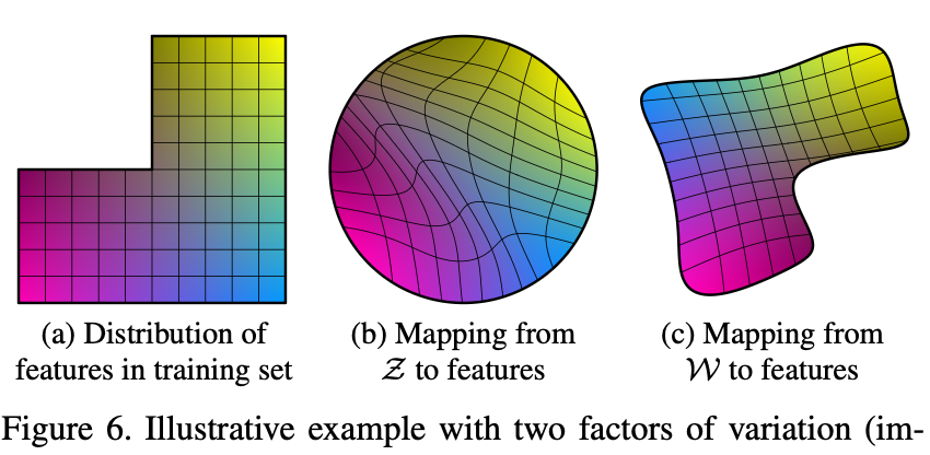 PGGAN의 Generator는 학습 데이터의 분포에 맞춰 이미지를 만드는데 이때 입력으로 사용하는 z는 Generator에게 직접 전달되기 때문에 Z 공간 자체가 학습 데이터의 확률분포를 따라간다. Z는 데이터 분포에 종속된 공간이라 말할 수 있다.