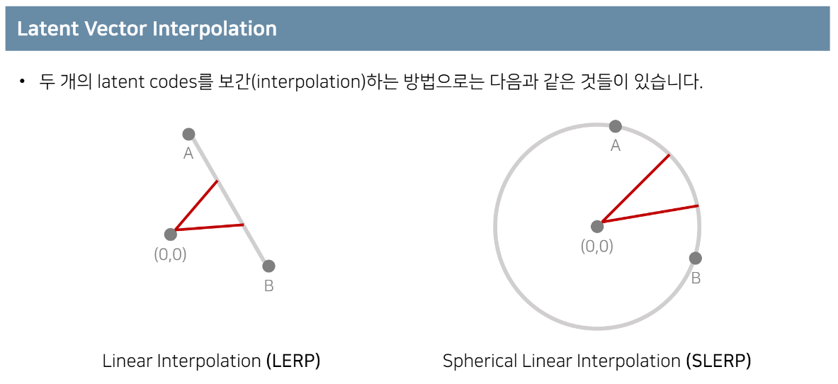 latent interpolation 보간법에는 두 가지 방법이 있는데, 이때 어떤 보간 방식을 쓰느냐에 따라 결과가 크게 달라질 수 있기 때문에