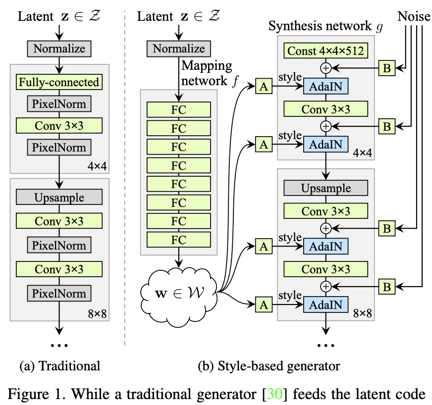 PGGAN는 낮은 해상도부터 높은 해상도까지 점진적으로 생성하는 생성모델로, z(노이즈 벡터, latent vector)를 정규화 후에 바로 Generator에 입력해 이미지 생성한다. 즉 z가 가진 모든 차원이 이미지의 모든 요소를 동시에 책임진다.