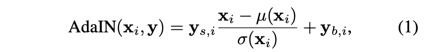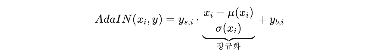 StyleGAN에서는 AdaIN이 이러한 정규화 역할을 대신 한다. AdaIN에서 위 수식은 정규화 역할을 담당하며, 각 채널별 feature를 평균 0, 분산 1로 정규화(InstanceNorm) 한다.