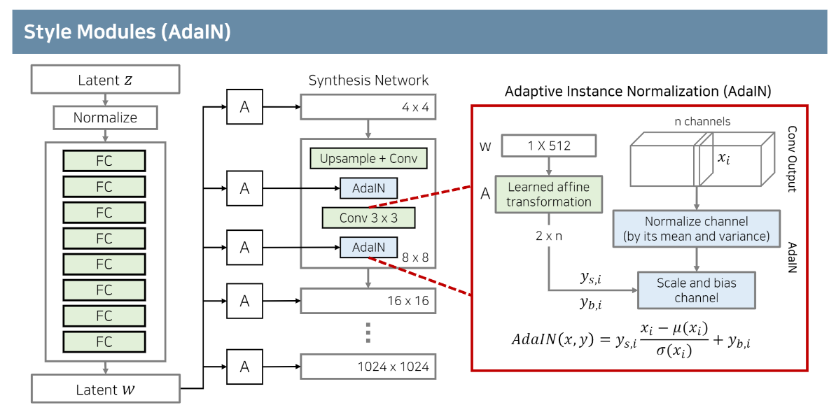 추가적으로 StyleGAN은 기존 GAN처럼 첫 레이어에만 latent를 넣는 것이 아니라, 이미지 생성의 모든 단계(4×4 ~ 1024×1024)에 w에서 만들어진 style(그림의 A)을 주입한다. 각 레이어에서는 AdaIN(Adaptive Instance Normalization)이 적용되는데, scale(ys)과 bias(yb) 값이 하나의 style로 작동한다.