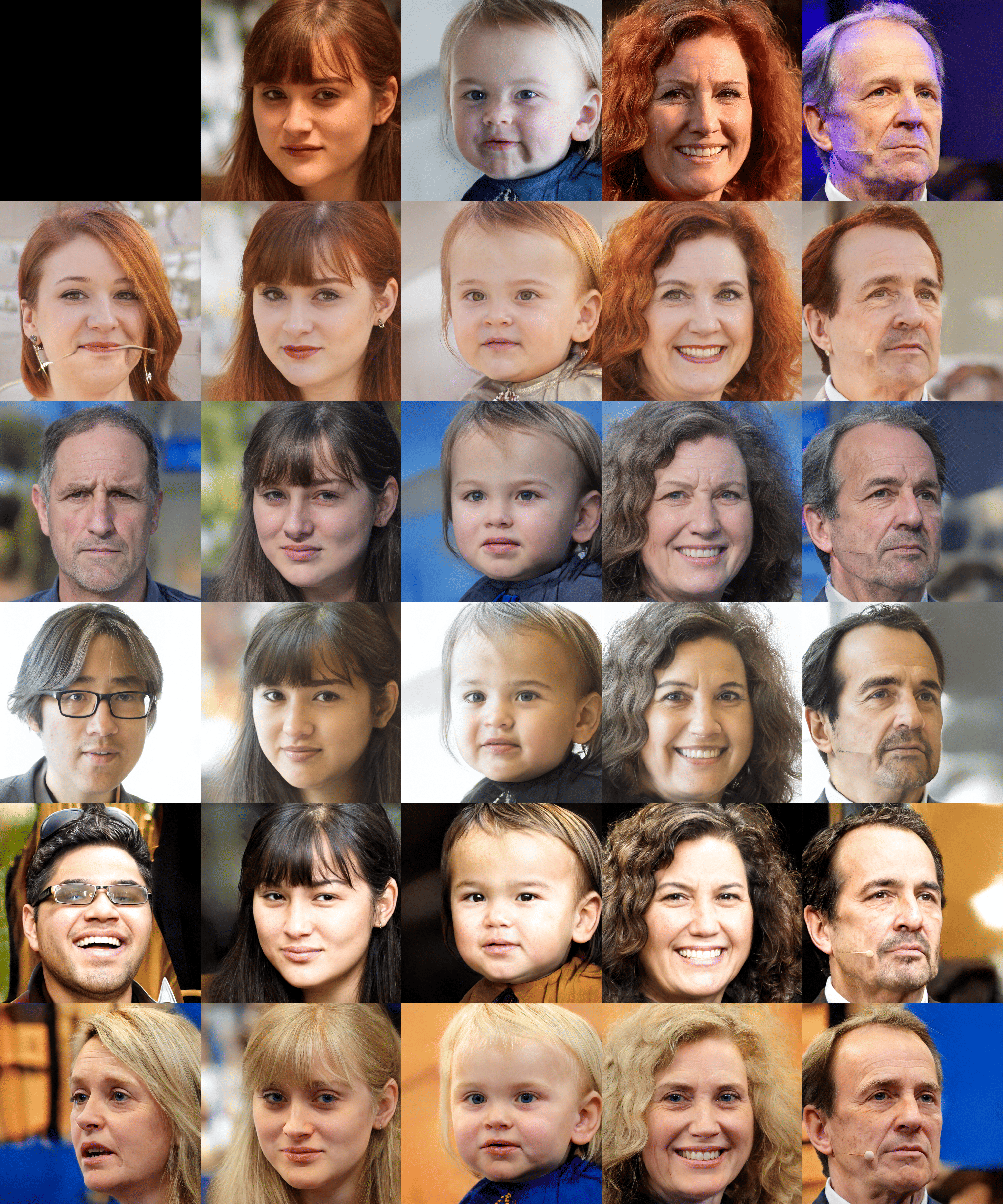- rows에 있는 latent는 coarse 스타일(큰 구조), cols에 있는 latent는 fine/middle 스타일(세부 특징)을 제공해서 스타일이 섞인 이미지 표를 생성