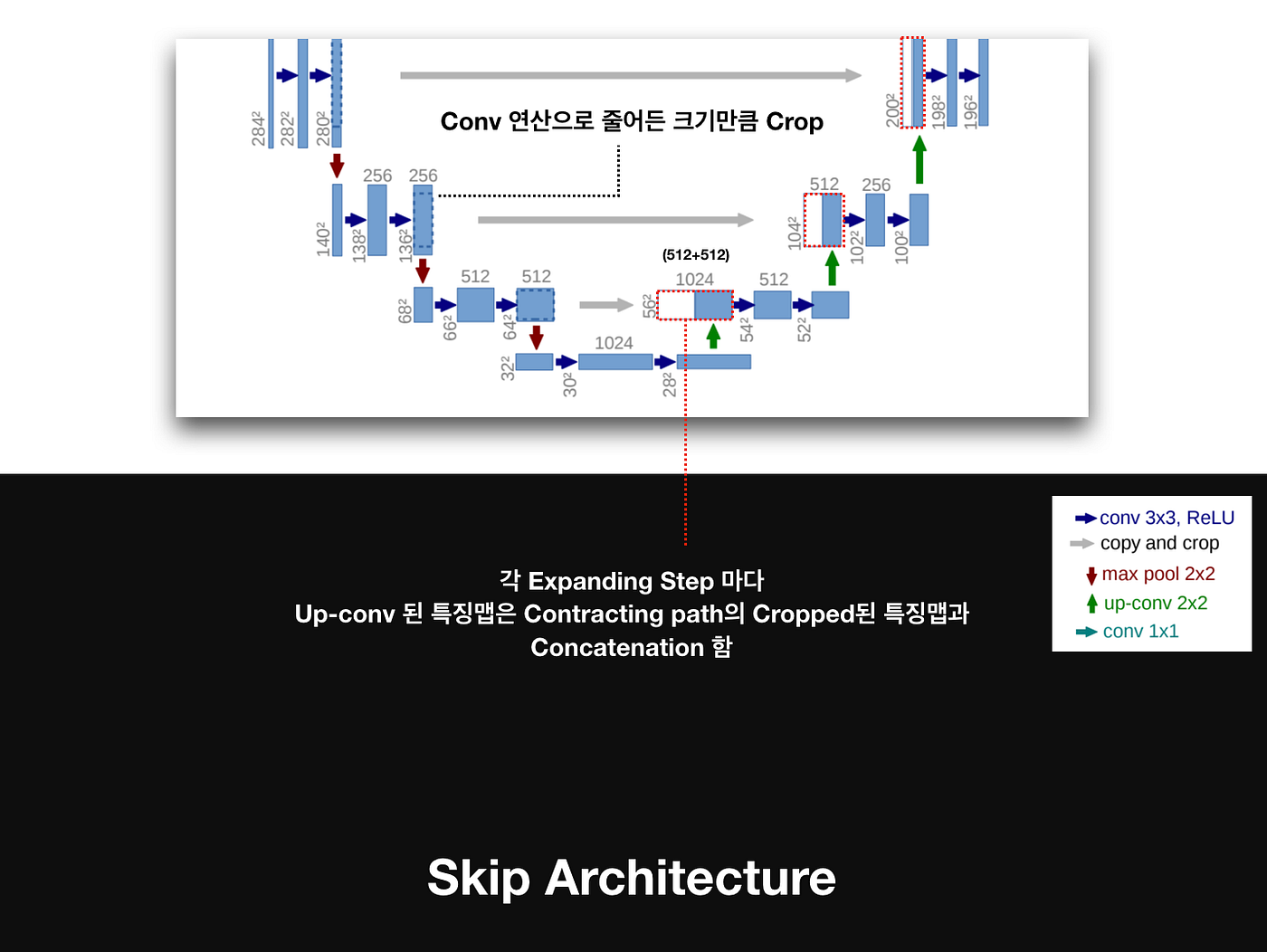 반대로 Expansive Path는 각 단계에서 feature map을 업샘플링한 뒤 2×2 up-convolution로 채널 수를 절반으로 줄이고, Contracting Path의 같은 해상도에서 가져온 feature map을 crop해서(concatenation 전에 크기 맞춤) concat한 다음, 다시 3×3 컨볼루션 2회 + ReLU을 적용한다.