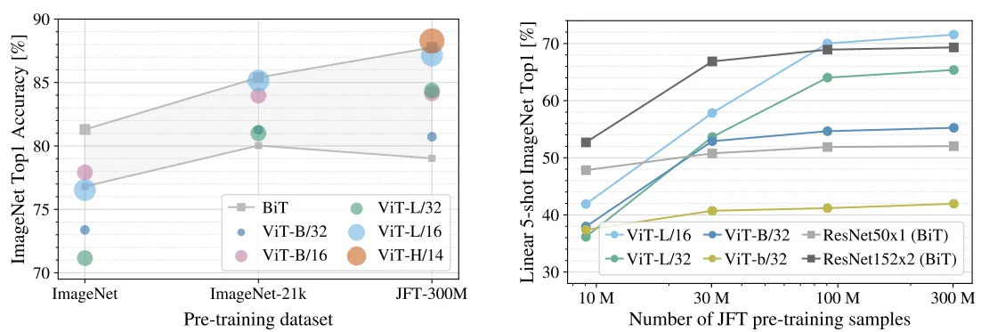다음으로 저자들은 JFT-300M에서 일부 데이터만 무작위로 뽑아 학습하는 실험도 진행했다. 이때는 정규화 효과를 배제하고, 순수하게 모델 자체의 특성을 비교하는 데 초점을 맞췄다. 작은 데이터셋에서는 ViT가 ResNet보다 더 쉽게 과적합되는 경향을 보였으나, 데이터가 충분히 많아지면 ViT는 CNN보다 더 좋은 성능을 기록했다.