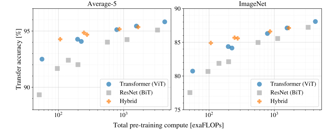 ViT는 모델과 데이터가 커질수록 성능이 꾸준히 상승하는 특징을 보였다. 반면 ResNet은 일정 규모를 넘어서면 성능 향상이 둔화되는 경향이 나타났다. 특히 같은 계산 비용 조건에서도 ViT가 더 좋은 성능을 내는 경우가 많았는데, 이는 Transformer 구조가 대규모 학습 환경에서 더 효율적으로 확장된다는 점을 보여준다.