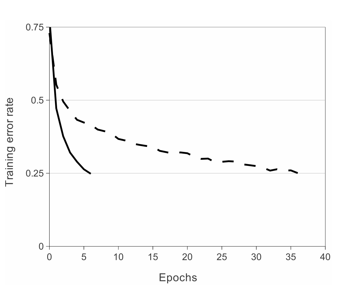 위 그림 1은 four-layer convolutional 네트워크가 CIFAR-10 데이터셋에서 25%의 훈련 오류를 달성하는데 필요한 반복 횟수를 나타낸다. 그림 1과 같이 ReLU를 사용한 결과(실선)는 tanh 뉴런을 사용한 결과(점선)보다 25% 훈련 오차율에 6배 더 빠르게 도달한다. 따라서 saturating 신경망 모델을 사용했다면 대규모 신경망 실험을 할 수 없었을 것이라고 말한다.