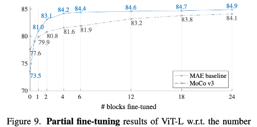 MoCo v3와 비교하면 MoCo v3는 linear probing 성능은 더 높지만, 일부 layer만 fine-tuning하는 경우에는 MAE가 일관되게 더 높은 성능을 보였다. 예를 들어 4개의 block을 fine-tuning할 때 약 2.6%의 성능 차이가 나타났다. 이는 MAE가 선형적으로 분리 가능한 특징은 약할 수 있지만, 비선형 표현 능력이 더 강하다는 것을 의미한다. 이러한 결과는 representation 품질을 평가할 때 linear separability으로 판단하는 것은 충분하지 않다는 점을 보여준다. 실제로 다른 연구에서도 linear probing 결과는 transfer learning 성능과 항상 높은 상관관계를 보이지 않는 것으로 보고되고 있다.