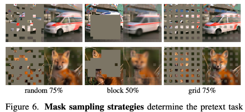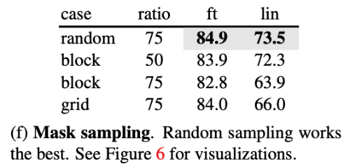 또한 mask sampling 전략도 비교하였다. BEiT에서 사용한 block-wise masking은 큰 영역을 한 번에 가리기 때문에 reconstruction이 더 어렵고 결과 이미지도 더 흐려지는 경향이 있다. 특히 masking ratio가 75%일 때 성능이 크게 감소하였다. 반면 grid-wise masking은 규칙적으로 patch를 남기기 때문에 reconstruction은 쉬워지고 결과 이미지도 선명하지만, representation의 품질은 낮아졌다. 실험 결과 단순한 random masking이 가장 좋은 성능을 보였으며, 높은 masking ratio를 유지하면서도 정확도와 학습 효율을 모두 확보할 수 있었다.