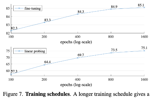 마지막으로 training schedule 길이의 영향을 분석하였다. pre-training epoch을 늘릴수록 성능은 꾸준히 향상되며 1600 epoch까지도 linear probing 성능의 포화가 나타나지 않았다. 이는 contrastive learning과 다른 특징으로 MoCo v3는 약 300 epoch에서 성능이 포화된다. 이러한 차이는 학습 과정에서 encoder가 보는 데이터 양의 차이와 관련이 있다. MAE에서는 masking 때문에 한 epoch에서 전체 patch의 약 25%만 encoder가 관찰하지만, contrastive learning에서는 두 개 이상의 crop을 사용하기 때문에 한 epoch에서 최대 200% 이상의 patch를 보게 된다.