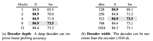 Decoder의 깊이는 linear probing 성능에 영향을 주는데, 이는 autoencoder 구조에서 마지막 층들이 주로 복원에 특화되기 때문이다. 충분히 깊은 decoder가 복원 작업을 담당하면 encoder의 latent representation이 더 추상적인 특징을 유지할 수 있어 linear probing 성능이 최대 8%까지 향상된다. 그러나 fine-tuning을 사용하는 경우에는 encoder의 마지막 층이 인식 작업에 맞게 조정되기 때문에 decoder 깊이의 영향이 상대적으로 작다. 실제로 Transformer block이 하나뿐인 매우 작은 decoder도 fine-tuning에서는 거의 동일한 성능을 보이며 학습 속도를 더 빠르게 만든다. 기본 설정에서는 8개의 block과 512차원의 폭을 가진 lightweight decoder를 사용하며, 이는 ViT-L encoder 대비 token당 약 9% 수준의 연산량만을 필요로 한다.