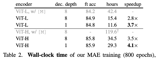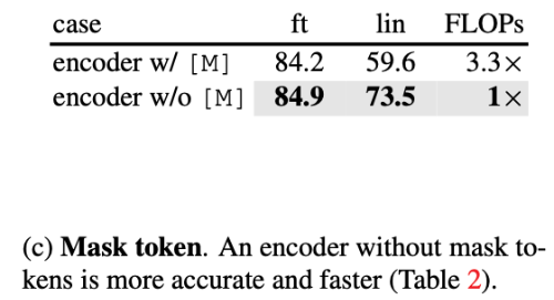 또 다른 중요한 설계는 encoder에서 mask token을 사용하지 않는 것이다. 기존 방식에서는 encoder 입력에 mask token을 포함하지만, MAE에서는 visible patch만 encoder에 입력하고 mask token은 decoder 단계에서 추가한다. encoder에 mask token을 넣으면 pre-training 단계에서는 많은 mask token을 보지만 실제 추론 시에는 존재하지 않는 입력을 학습하게 되어 성능이 저하된다. 실험에서도 mask token을 encoder에 포함하면 linear probing 정확도가 약 14% 감소하는 것으로 나타났다. 또한 encoder에서 mask token을 제거하면 연산량도 크게 줄어들어 전체 학습 FLOPs가 약 3.3배 감소하고 실제 학습 속도도 약 2.8배 빨라진다. 높은 masking ratio로 인해 self-attention 계산량이 줄어드는 효과까지 더해져 메모리 사용량 역시 크게 감소하며, 결과적으로 더 큰 모델을 효율적으로 학습할 수 있다.