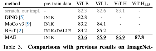 Table 3에서 기존 self-supervised 방법들과 비교해보면 ViT-B 모델에서는 대부분의 self-supervised 방법들이 비슷한 성능을 보였지만, 더 큰 모델인 ViT-L에서는 방법 간 성능 차이가 커졌다. 이는 대형 모델일수록 overfitting을 줄이는 것이 중요한 문제임을 보여준다. MAE는 모델 크기를 쉽게 확장할 수 있으며 모델이 커질수록 성능이 꾸준히 향상된다.