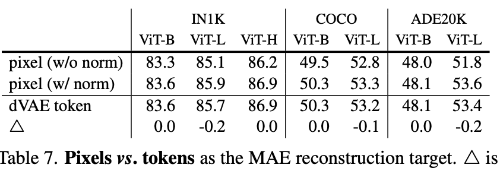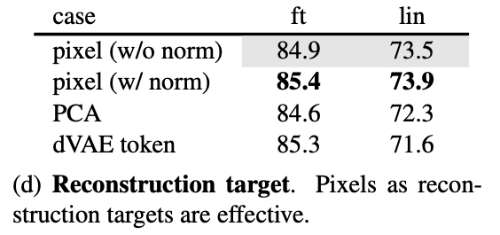 또한 reconstruction target으로 pixel과 token 방식을 비교하였다. dVAE token을 사용하는 방식은 정규화되지 않은 pixel보다 약간 좋은 결과를 보였지만, 정규화된 pixel을 사용하는 MAE와는 거의 차이가 없었다. 이 결과는 MAE에서 tokenization이 필수적인 요소가 아니라는 것을 보여준다.