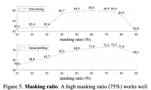 MAE의 중요한 특징 중 하나는 매우 높은 masking ratio를 사용한다는 점이다. 실험 결과 약 75%의 패치를 가리는 설정이 가장 좋은 성능을 보였다. 이는 BERT에서 일반적으로 사용하는 15% masking이나 기존 컴퓨터 비전의 masked modeling(20~50%)보다 훨씬 높은 수준이다. 높은 비율로 패치를 가려도 모델은 단순히 텍스처를 보간하는 것이 아니라 객체와 장면의 전체 구조를 이해하며 가려진 영역을 추론한다. Linear probing에서는 masking ratio가 높아질수록 성능이 크게 향상되며 최대 약 20%의 정확도 차이가 나타난다. 반면 fine-tuning에서는 masking ratio에 대한 민감도가 낮아 40~80% 범위에서 모두 안정적인 성능을 보인다.