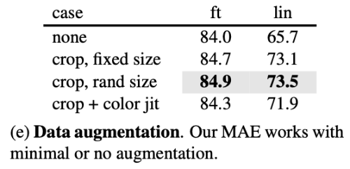 다음으로 data augmentation의 영향을 분석하였다. MAE는 cropping 기반 augmentation만으로도 충분히 잘 동작하며 random crop 또는 fixed-size crop에 horizontal flipping 정도만 사용해도 높은 성능을 얻는다. 반면 color jittering을 추가하면 오히려 성능이 감소하였다. MAE는 data augmentation이 거의 없어도 안정적으로 학습되는 특징을 보인다. 이는 contrastive learning 방식과 큰 차이인데, contrastive 방법들은 강한 augmentation에 크게 의존한다. MAE에서는 random masking 자체가 새로운 학습 샘플을 생성하는 역할을 하므로 별도의 augmentation이 크게 필요하지 않다고 언급했다.