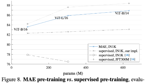 다음으로 supervised pre-training과의 비교도 수행하였다. 기존 ViT 연구에서는 ViT-L을 ImageNet-1K에서 supervised 방식으로 학습할 경우 성능이 쉽게 포화되는 문제가 있었다. 반면 MAE pre-training을 사용하면 모델 용량이 커질수록 성능 향상이 더 크게 나타나며, 이는 대규모 데이터(JFT-300M)를 사용한 supervised pre-training과 유사한 scaling 효과를 보인다.