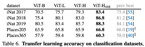 Classification transfer 실험에서는 iNaturalist와 Places 데이터셋을 사용하였다. iNaturalist에서는 모델 크기가 커질수록 성능이 크게 향상되는 scaling 특성이 나타났으며 기존 최고 성능을 크게 넘어섰다. Places 데이터셋에서도 MAE는 이전 최고 성능을 기록한 방법들보다 더 높은 정확도를 보였는데, 이 기존 방법들은 수십억 장의 이미지로 pre-training한 모델이었다. 반면 MAE는 ImageNet-1K만 사용했음에도 더 좋은 성능을 달성하였다.