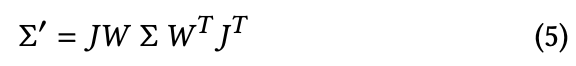 이 식은 공간의 한 점 x에서 해당 Gaussian의 값을 계산하는 식이다. 여기서 μ는 Gaussian의 중심 위치이고 Σ는 Gaussian의 모양을 결정하는 공분산 행렬이다. 렌더링 과정에서는 이 Gaussian 값에 opacity α를 곱해 색을 합성하는 데 사용된다. 하지만 실제로 이미지를 생성하기 위해서는 이 3차원 Gaussian을 카메라 이미지 평면으로 투영해야 한다. 논문에서는 기존의 EWA splatting 연구에서 사용된 방법을 활용하여 3D Gaussian을 2D Gaussian으로 변환한다. 카메라 좌표계로 변환된 공분산 행렬은 다음과 같이 계산된다.