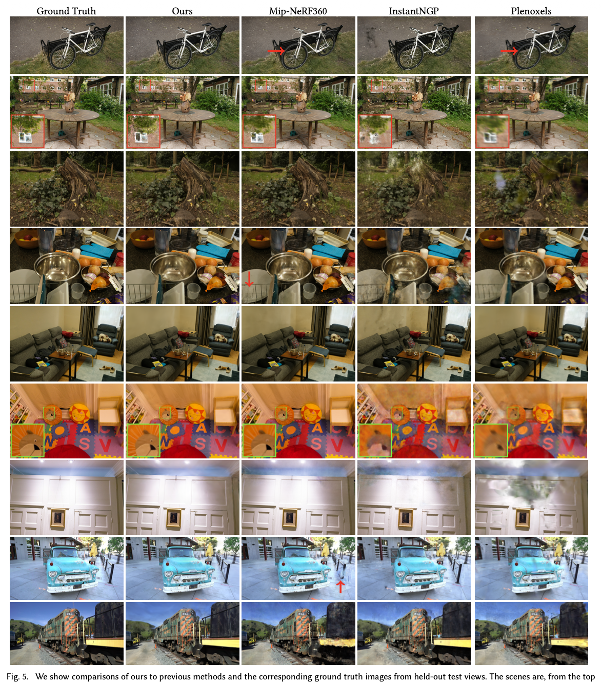 마지막으로 spherical harmonics의 사용 효과도 평가(No-SH와 Full 비교)하였다. SH를 사용하면 시점에 따라 변하는 반사 효과를 표현할 수 있어 전체 PSNR 성능이 향상되는 것을 확인하였다(Table 3).