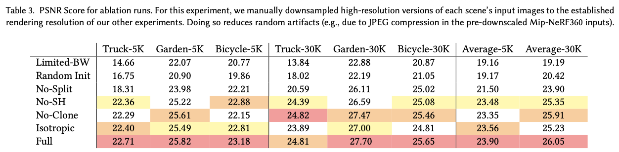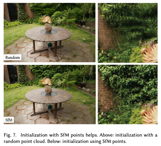 ablation 실험에서는 먼저 SfM 초기화의 중요성을 평가하기 위해 SfM 포인트 대신 카메라 bounding box보다 세 배 큰 공간에서 무작위 Gaussian을 생성하여 학습을 수행(Random Init과 Full 비교)하였다. 이 경우는 아래와 같으며, 전체적으로는 동작하지만 배경 영역에서 성능이 저하되고 floaters가 더 많이 발생하는 것을 확인하였다.