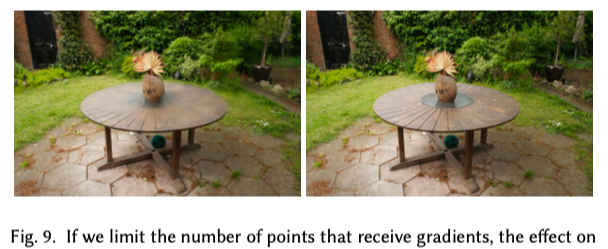 gradient를 받는 splat 수를 제한하는 방법도 실험(Limited-BW)하였다. Pulsar 방식처럼 앞쪽 N개의 Gaussian만 gradient를 받도록 설정하여 N=10으로 실험한 결과, 학습이 불안정해지고 PSNR이 크게 감소하였다. 예를 들어 표3의 Truck-30K 장면에서는 PSNR이 약 11dB 감소하였으며, Garden의 결과는 Fig. 9에 나타난다.