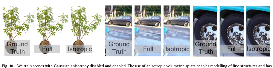 anisotropic covariance의 효과도 분석(Isotropic과 Full 비교)하였다. 이 실험에서는 Gaussian의 공분산을 전체 행렬 대신 하나의 스칼라 값으로 제한하여 isotropic Gaussian만 사용하도록 하였다. 결과적으로 Gaussian이 표면 방향에 맞게 정렬되지 못해 재구성 품질이 크게 감소하였다. 이러한 차이는 Fig. 10에서 확인할 수 있다.
