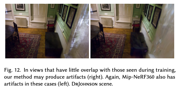 Section 7.4에서는 방법의 한계점을 설명한다. 다른 방법들과 비슷하게 입력 이미지에서 충분히 관측되지 않은 영역에서는 원래 장면에는 없는 인공적인 시각적 오류(artifact)가 발생할 수 있다. 또한 anisotropic Gaussian을 사용할 때 길게 늘어난 Gaussian이나 얼룩처럼 보이는(splotchy) artifact가 나타날 수 있으며 이러한 사례는 Fig. 12에서 확인할 수 있다. 일부 장면에서는 큰 Gaussian이 생성되면서 시점이 바뀔 때 갑작스러운 시각적 변화(popping)가 발생하기도 한다. 이러한 문제는 rasterizer의 culling 방식과 단순한 가시성 처리에서 일부 발생하는 것으로, 향후 개선될 수 있다고 언급한다.