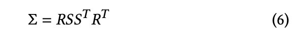 또 하나 중요한 문제는 공분산 행렬을 직접 학습하는 것이 쉽지 않다는 점이다. 공분산 행렬은 반드시 positive semi-definite여야 하는데, 일반적인 gradient descent로 직접 Σ를 업데이트하면 이러한 조건이 쉽게 깨질 수 있다. 이를 해결하기 위해 논문에서는 공분산 행렬을 직접 학습하지 않고 회전과 스케일의 조합으로 표현한다. 공분산 행렬은 다음과 같이 분해된다.