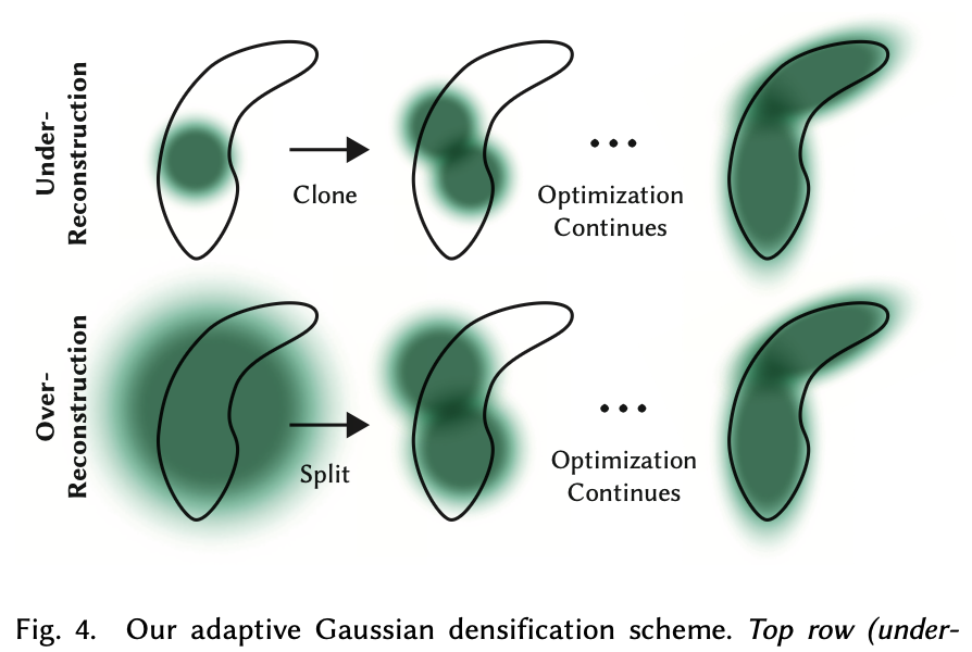 densification은 두 가지 방식으로 수행된다. 작은 Gaussian이 geometry가 부족한 영역에 있을 경우 Gaussian을 복제하여 gradient 방향으로 이동시키는 cloning을 수행하고, 큰 Gaussian이 복잡한 영역을 덮고 있는 경우 두 개의 Gaussian으로 나누는 splitting을 수행한다. splitting 시 scale은 φ = 1.6으로 나누며 새로운 Gaussian의 위치는 기존 Gaussian을 확률 분포로 사용해 샘플링하여 초기화한다. 또한 floaters는 실제 물체 표면이 아닌 공간 중간에 잘못 생성된 Gaussian 또는 geometry로, depth ambiguity로 인해 발생하는 재구성 오류이다. 이를 완화하기 위해 논문에서는 3000 iteration마다 Gaussian의 opacity를 거의 0으로 초기화하고, 이후 학습 과정에서 필요 없는 Gaussian을 제거한다. 추가로 world space에서 지나치게 크거나 view space에서 footprint가 큰 Gaussian도 주기적으로 제거하여 전체 Gaussian 수를 안정적으로 유지한다.