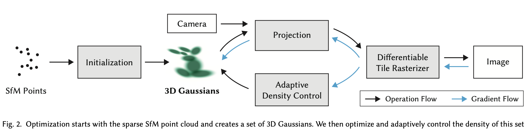 전체 흐름은 논문 Figure 2에서 나타난다. 먼저 SfM point cloud로부터 초기 Gaussian들을 생성하고, 이후 Gaussian의 파라미터를 반복적으로 최적화하면서 Gaussian의 밀도를 조절하는 과정을 거친다. 마지막으로 tile 기반의 빠른 rasterizer를 이용해 Gaussian splatting을 수행하여 이미지를 렌더링한다. 이 과정은 미분 가능하도록 설계되어 있어 렌더링 결과와 실제 이미지 사이의 차이를 이용해 Gaussian 파라미터를 학습할 수 있다.