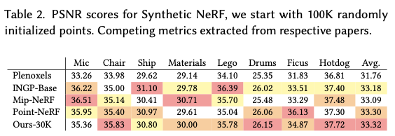 synthetic Blender dataset 실험에서는 다양한 시점의 이미지와 정확한 카메라 파라미터가 제공되기 때문에, 이러한 환경에서는 SfM 초기화 없이 SOTA 성능을 달성할 수 있다. 장면 영역에 100K개의 Gaussian을 무작위로 배치해 학습을 시작하며, optimization 과정에서 불필요한 Gaussian이 제거되어 약 6K~10K개만 남는다. 이후 densification을 통해 최종적으로 200K~500K개의 Gaussian으로 장면을 표현한다. PSNR 결과는 Table 2에 제시된다.