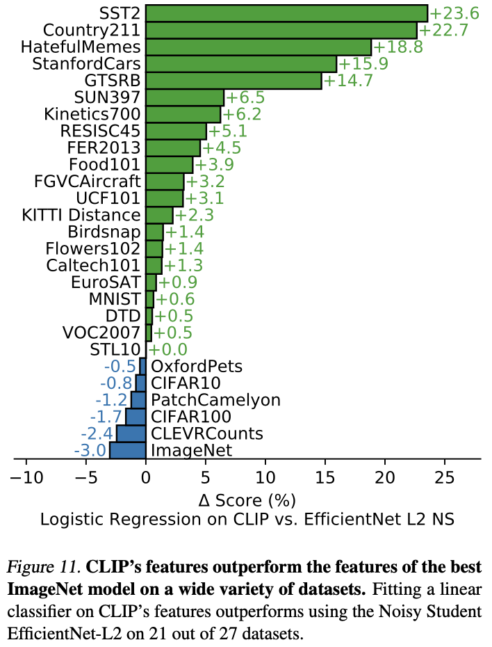 CLIP은 27개 데이터셋 중 21개에서 Noisy Student EfficientNet-L2를 능가했으며, 특히 언어 기반 추론이나 동사 개념이 포함된 작업에서 가장 큰 향상을 보였다. 그러나 ImageNet이나 CIFAR 계열의 저해상도 데이터에서는 효율적이지 않았다.